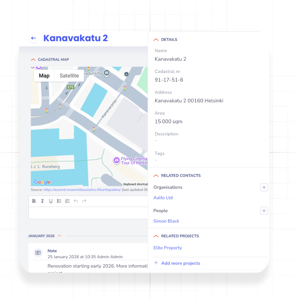 Kiinteistörekisterin näet nopeasti kiinteistöjen ajantasaiset tiedot ja saat kokonaiskuvan niihin liittyvistä projekteista, henkilöistä ja muista osapuolista.